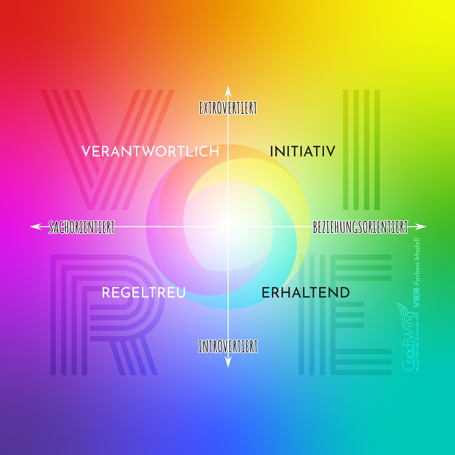Das VIER-Farben Modell ordnet jede Persönlichkeit vier Grundtypen zu. Die grafische Darstellung hilft Ihnen die Einteilung und die Stärken der einzelnen (oder "Misch-")Typen zu erkennen. Es ist ergänzend zu unserer Kartenmethode und eignet sich als Einführung sowie Vertiefung des VIER-Farben Modells.